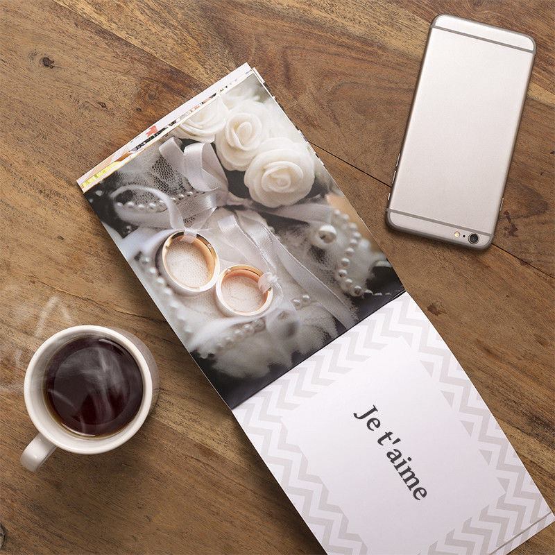 Compact et raffiné, ce livre photo 19 x 14 cm tient facilement dans une main mais renferme toute votre histoire. Chaque page de gauche accueille une photo tandis que la page de droite est réservée à vos mots d'amour, vos anecdotes ou votre demande en mariage. Vous choisissez la couverture, les 12 clichés et le titre ; nous nous chargeons d’imprimer votre album photo personnalisable avec des encres à base d’eau pour un rendu éclatant et durable. Vous obtenez ainsi un véritable livre photo personnalisé avec texte qui traversera les années.