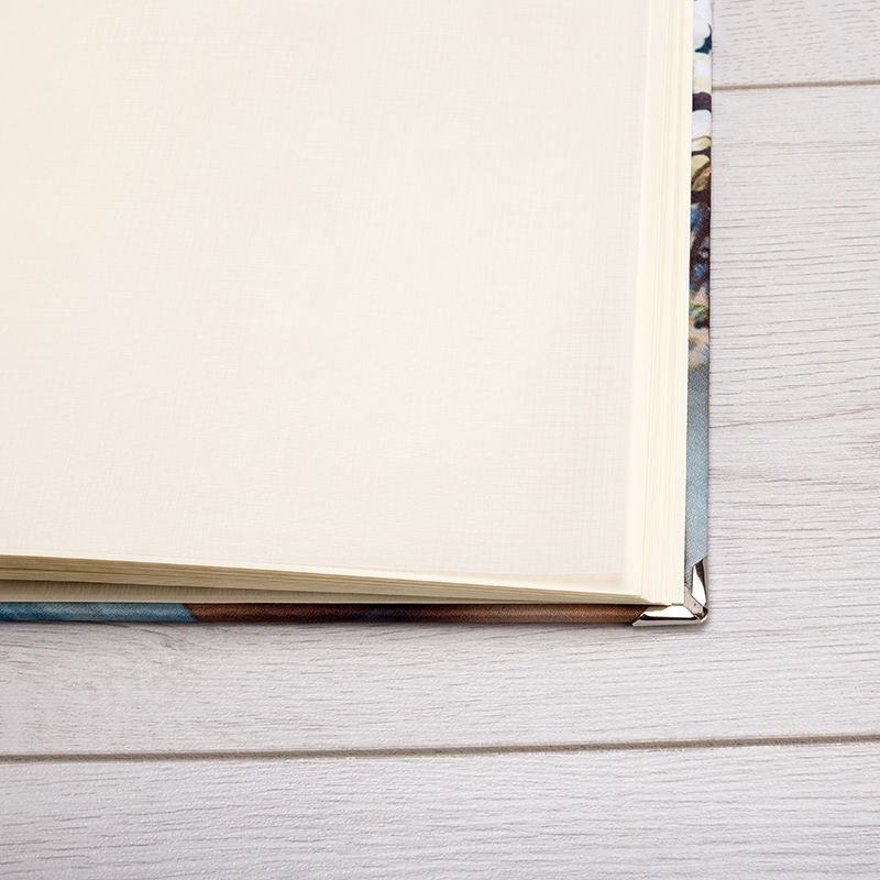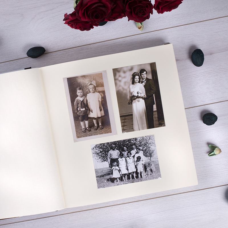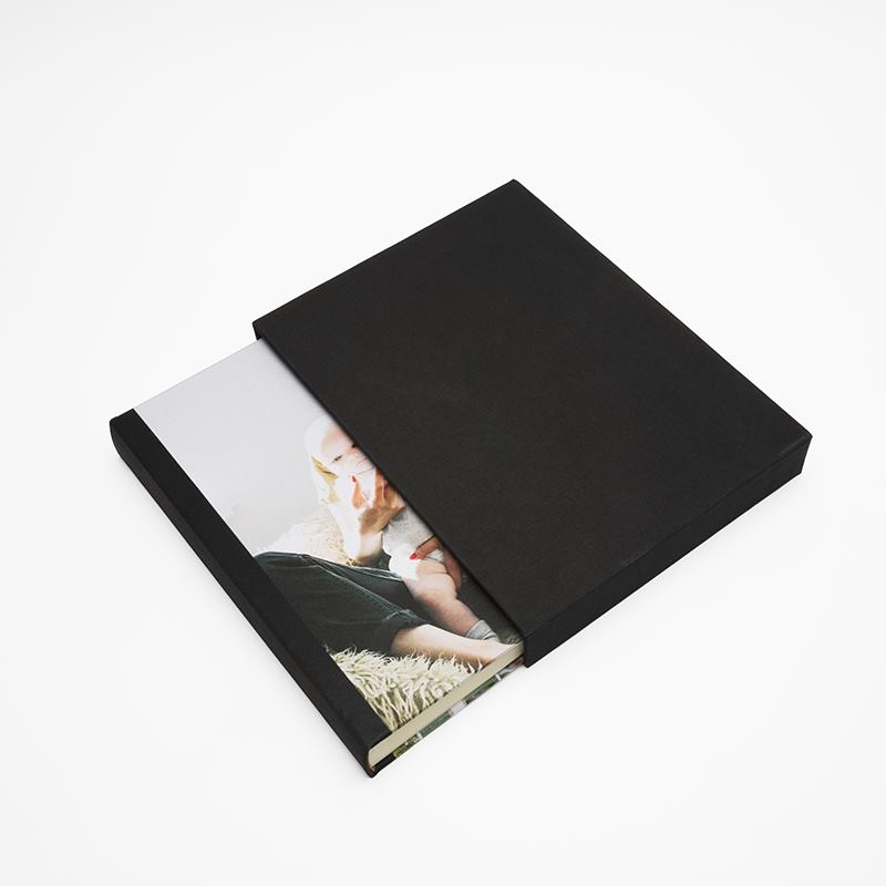 Nous imprimons vos photos sur du tissu satin à l'aide d'une technique spécialisée qui garantit un rendu magnifique. Le tissu est ensuite collé sur le recto et le verso de la couverture rigide du livre, puis nos artisans relient les pages intérieures en papier épais de couleur ivoire provenant d'Italie. Chaque page est intercalée avec du papier style parchemin pour pouvoir protéger les photos que vous mettez dans le livre. Votre album est ensuite vérifié méticuleusement avant de vous être envoyé et si vous avez sélectionné cette option, nous le mettrons dans un étui de protection noir.