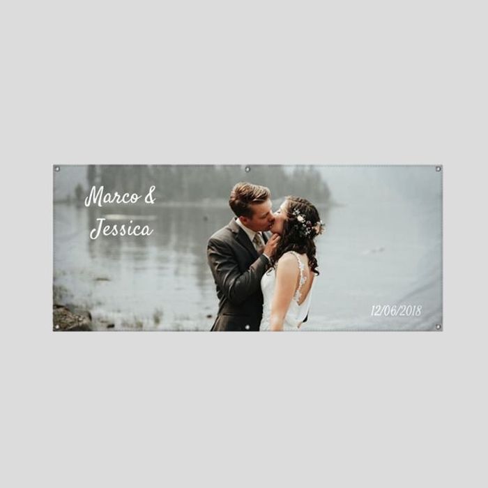 Utilisez votre photo préférée de vous et de votre partenaire pour créer une superbe bannière de fiançailles personnalisée. Vous pouvez utiliser l'outil texte pour ajouter des dates à votre bannière personnalisée. Cela peut inclure la date de votre rencontre, celle de vos fiançailles et celle de votre mariage. C'est une merveilleuse façon d'ajouter une touche personnelle à n'importe quelle fête et de garder un souvenir précieux de vos moments marquants.