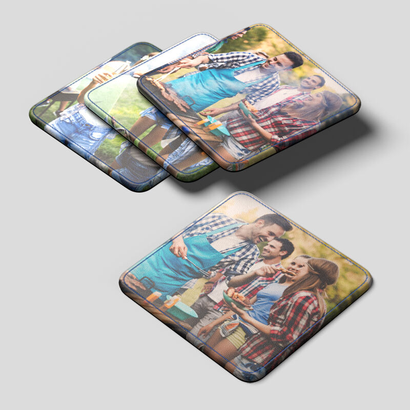 Imprimez vos photos préférées, slogans ou créations sur votre propre ensemble de dessous de verres personnalisés. Une idée cadeau parfaite pour de nouveaux propriétaires, ces dessous de verres en cuir avec logo sont fabriqués avec un cuir Nappa ou une alternative végan de haute qualité.