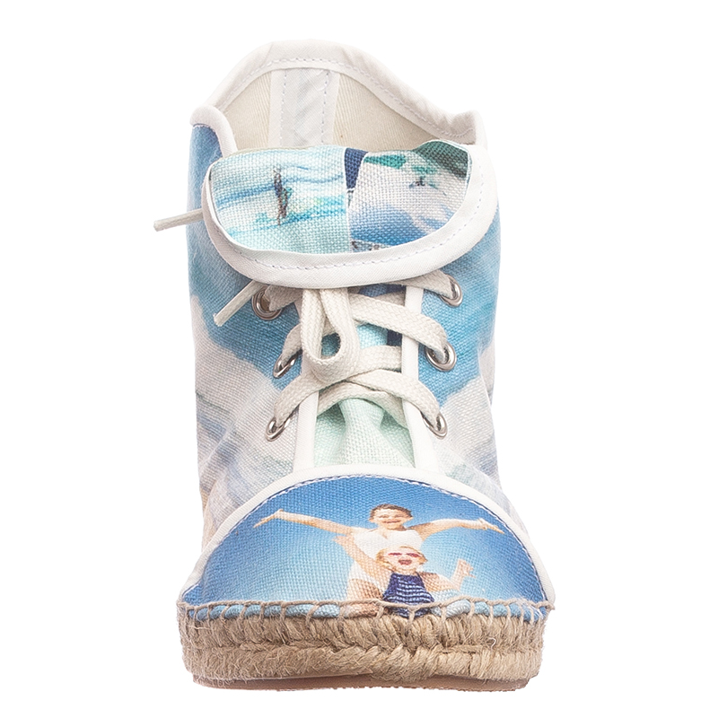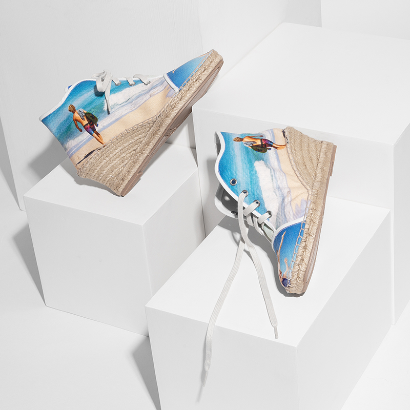 Vous pouvez personnaliser vos espadrilles sur plusieurs zones, ce qui signifie que vos photos couvriront l'ensemble de la chaussure. Il est important de tenir compte de la forme de la chaussure lorsque vous téléchargez vos photos. Par exemple, les détails importants doivent être placés au centre et maintenus à l’écart des bords, ainsi ils ne seront pas coupés par les coutures. Il est également important de prendre en compte les oeillets du lacet lors du placement de votre design, car ceux-ci pourraient cacher les détails imprimés dans la même zone. La semelle de votre espadrille est en jute naturel, donc pensez aux couleurs qui s'accorderaient au mieux. Puisque vous pouvez également personnaliser la languette, gardez à l'esprit que les lacets recouvriront une partie de celle-ci. Il est ainsi préférable d'avoir un motif répété ou une couleur unie pour le recto de la languette. Le verso de la languette est idéal pour imprimer des logos ou des messages.