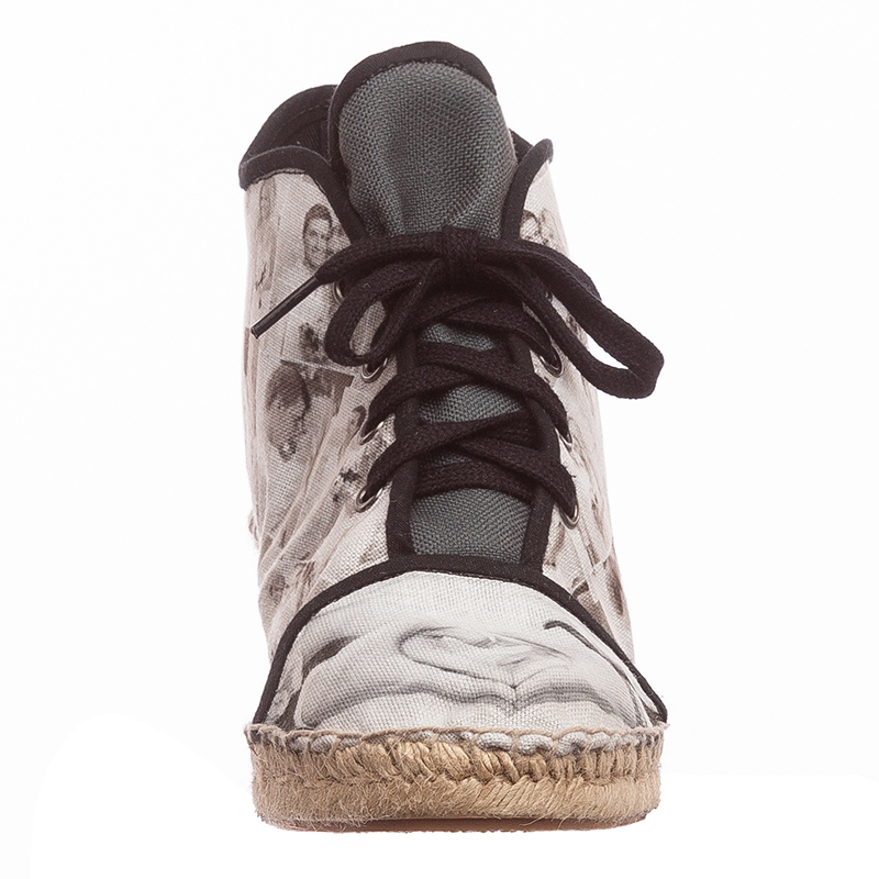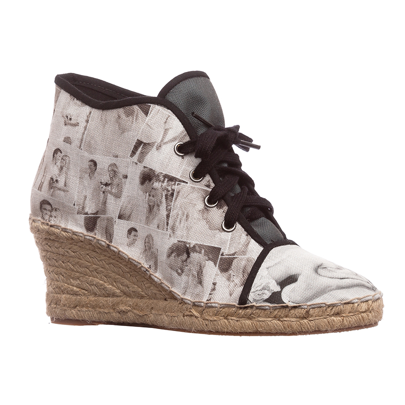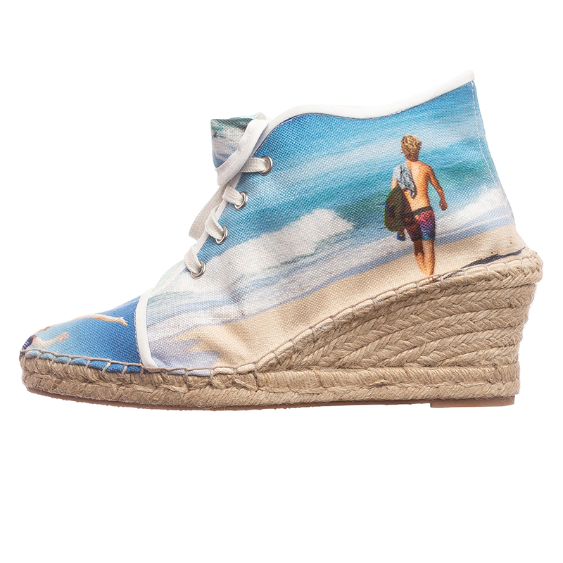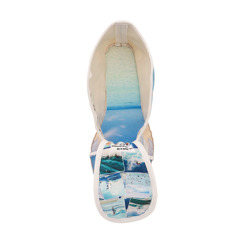 Les années d'expérience dans la fabrication de chaussures personnalisées nous ont donné les outils nécessaires pour créer une paire d'espadrilles compensées époustouflantes. Elles sont imprimées dans nos locaux sur notre tissu toile Haverstock élégant et vintage. Notre technique d'impression à la pointe permet d'avoir un rendu avec des couleurs vibrantes et une impression permanente. Ce tissu respirant et aéré est utilisé pour créer l'extérieur de vos chaussures, où vous effectuez votre personnalisation avec vos photos. Une fois le tissu imprimé, les talons sont coupés et cousus au tissu avec perfection. Vous pouvez opter pour des finitions en couleur naturelle ou en noir, ce qui comprend les lacets, la reliure et les œillets. Quand vous choisissez les finitions noires, la doublure de la chaussure restera couleur naturelle. La semelle intérieur est disponible en tissu ou en cuir et elle est doublée avec du coton léger. Pour une paire de chaussures vegan, optez pour la semelle en tissu. Une fois que les chaussures ont été coupées, cousues et façonnées, elles sont collées et cousues sur la semelle en jute naturel qui provient d'Espagne. Cela donne à vos chaussures un magnifique look vintage.