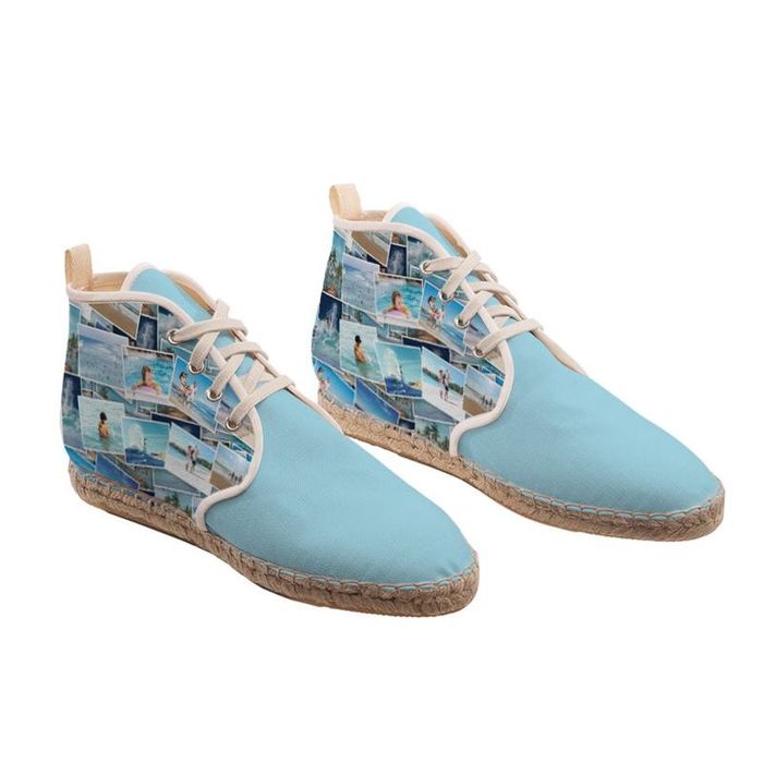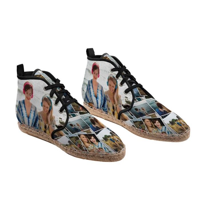 Vous avez la possibilité de personnaliser jusqu'à 8 zones différentes sur les espadrilles hautes, donc n'hésitez pas à utiliser plusieurs photos. Notre interface en ligne vous permet également de créer plusieurs types de montages photos, si vous ne savez pas quelle image choisir. Afin de compléter au mieux vos photos, vous pouvez choisir la couleur des finitions de vos espadrilles hautes personnalisées. Si vous sélectionnez les finitions de l'espadrille en noir, les lacets et les finitions seront également noirs, tandis que les œillets seront gris. Pour l'intérieur en blanc crème, vous aurez des lacets et des finitions de la même couleur, avec des oeillets argentés. La doublure intérieure de vos espadrilles sera toujours de couleur naturelle.
