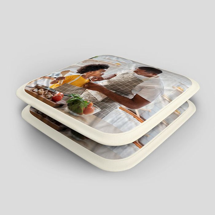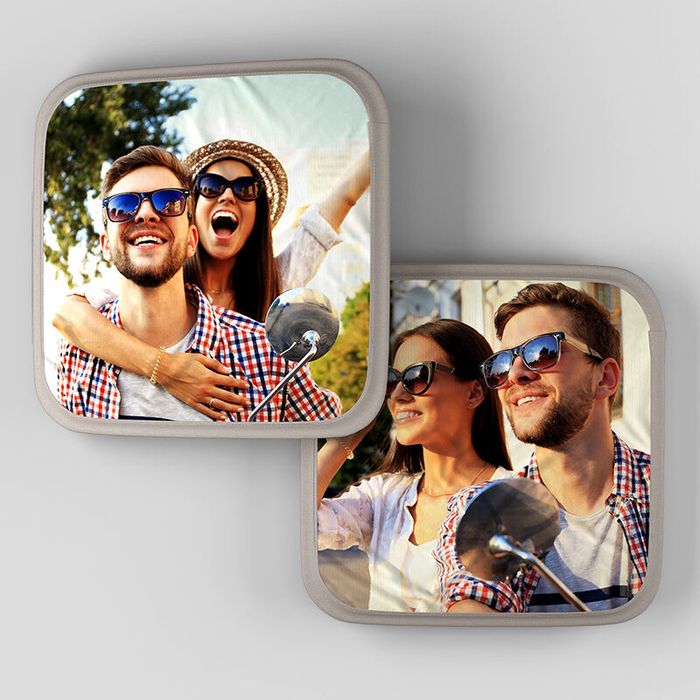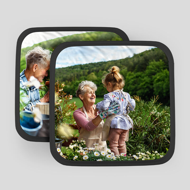 Nous imprimons vos photos directement sur le tissu résistant à la chaleur grâce à une technique d'impression à la pointe de la technologie. Nos artisans découpent et cousent ensuite le tissu avec une bordure beige, noire ou grise selon votre préférence, en insérant un épais rembourrage à l'intérieur. Ils ajoutent également dans le coin une boucle de la même couleur que la bordure, pour que vous puissiez suspendre facilement la manique personnalisée dans votre cuisine. Deux petites poches sont cousues sur le verso de la manique, ce qui vous permet d'insérer vos mains en toute sécurité.