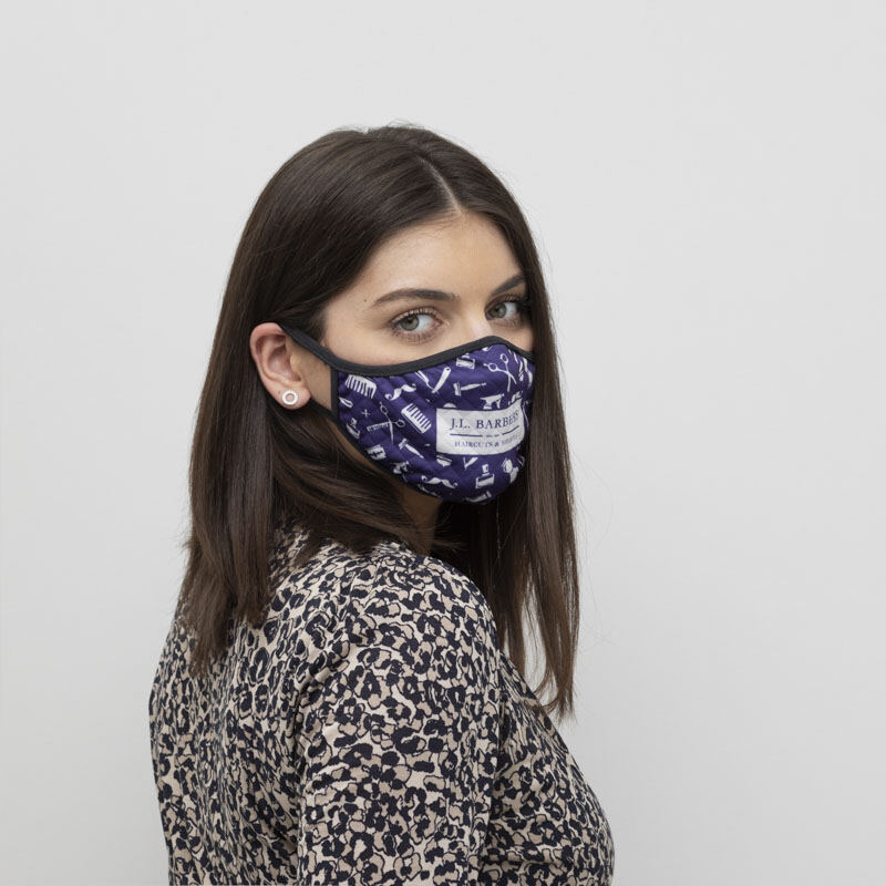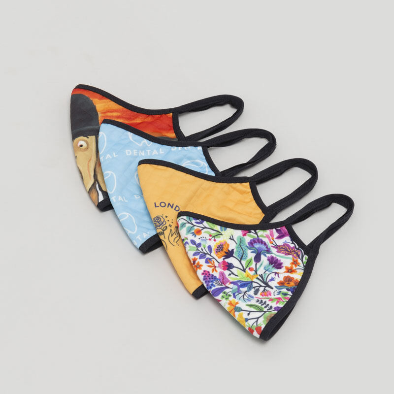 Nous imprimons le tissu, le coupons et le cousons, idéal pour des masques à la coupe agréable. Créez un masque personnalise avec le logo de votre entreprise et montrez à votre société que vous vous souciez de la sécurité. Le niveau de commande minimum est un pack de deux ou quatre. Les plus grosses commandes prendront plus de temps à produire.