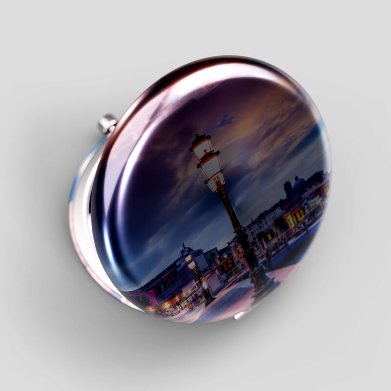 Pour protéger l'intérieur de votre miroir de poche personnalisé, un fermoir y sera présent pour le maintenir bien fermé. Pour l’ouvrir, il vous suffira simplement d’exercer une légère pression sur le bouton prévu à cet effet. Votre accessoire peut également être livré avec une jolie pochette de protection si vous la souhaitez ; nous vous recommandons de la prendre pour pourvoir y ranger votre miroir afin d'éviter toute rayure. Vous remarquerez surement en l’ouvrant qu'il contiendra 2 faces miroitantes : l'une classique, l’autre grossissante. Lorsque vous aurez fini de vous admirer, il vous suffira de le refermer et de le glisser dans sa pochette.