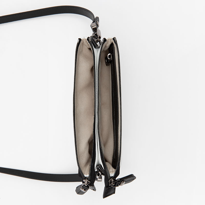 Créez votre pochette double personnalisée avec deux pochettes zippées, un passepoil et une sangle en cuir noir.