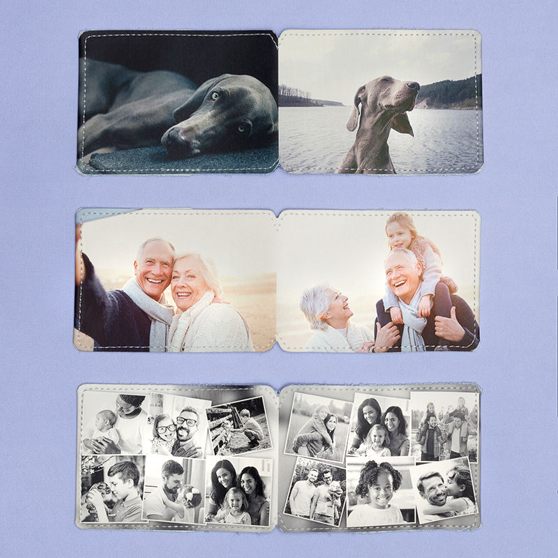 Votre porte-carte photo est personnalisable indépendamment sur 4 zones différentes : le recto de l'extérieur, le verso de l'extérieur, la poche intérieure gauche et la poche intérieure droite. Cela vous laisse la possibilité de créer plusieurs thèmes si vous le souhaitez ou de garder une certaine uniformité lorsque vous imprimez vos photos.