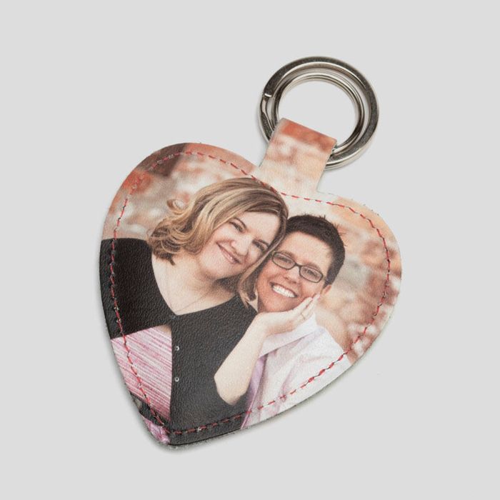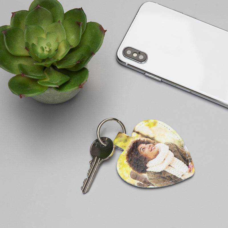 Le porte clé photo cœur est typiquement créé en cuir Nappa lisse ou texturé mais il y a aussi une option en faux cuir.