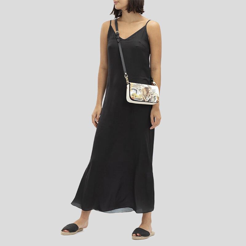 Les parties du sac qui ne sont pas imprimées sont fabriquées en cuir Nappa noir lisse. Il s'agit de la zone arrière, des zones couvertes par le rabat, des anneaux en D et de la bandoulière. Cela permet à vos photos de ressortir et d'être le point de mire de votre pochette personnalisée. Vous pouvez choisir entre deux lanières réglables, dont l'une est amovible et entièrement réalisée en cuir Nappa, tandis que l'autre est fixée au sac et réalisée en cuir Nappa avec une chaîne en métal. La lanière amovible en cuir est réglable de 130 cm à 139,5 cm, tandis que la lanière en cuir et chaîne est réglable de 114 cm à 128 cm.