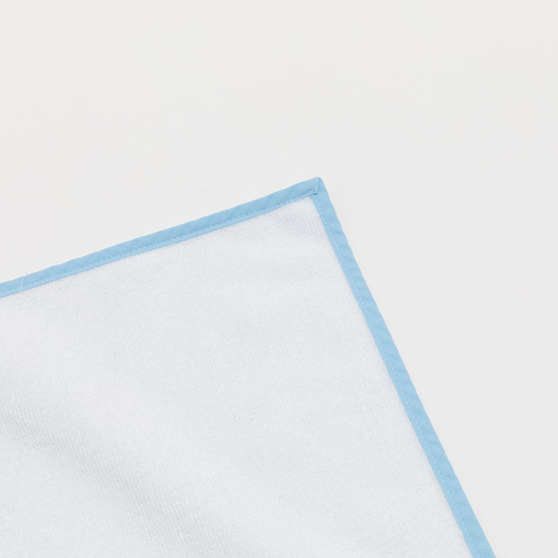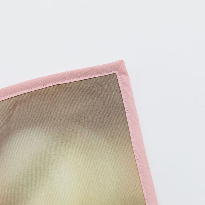 La serviette personnalisée pour bébé est fabriquée à la main dans nos ateliers par des techniciens qualifiés. Vos motifs sont imprimés à l'aide d'un procédé spécial qui permet aux encres d'entrer profondément dans les fibres, assurant que l'impression ne se décolore pas avec le temps. Les bords sont cousus à la main dans un choix de 4 couleurs différentes.