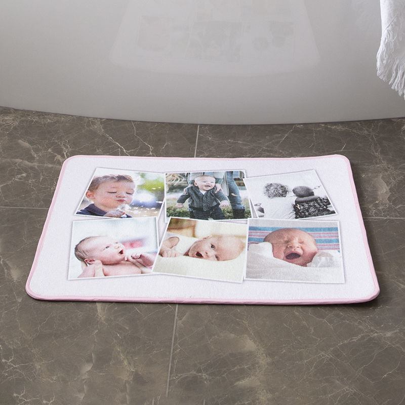 Le tissu éponge microfibre possède une base blanche ; privilégiez donc des motifs clairs ou pastel pour un rendu impeccable. Un collage permet d’intégrer plusieurs souvenirs sur un seul tapis.