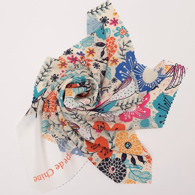 Soie 100% naturelle.16mm ou 60g/m. Couleur de base blanc cassé avec une brillance. Qualité douce et légère, avec un fini crêpé et de légères côtes sur la trame. Aéré, léger et flottant, doux mais solide. Chevauche la frontière entre la mode et les accessoires de mode. Rétrécissement attendu de 5% sur la trame, 8% sur la chaîne. Impression réactive de grande qualité.